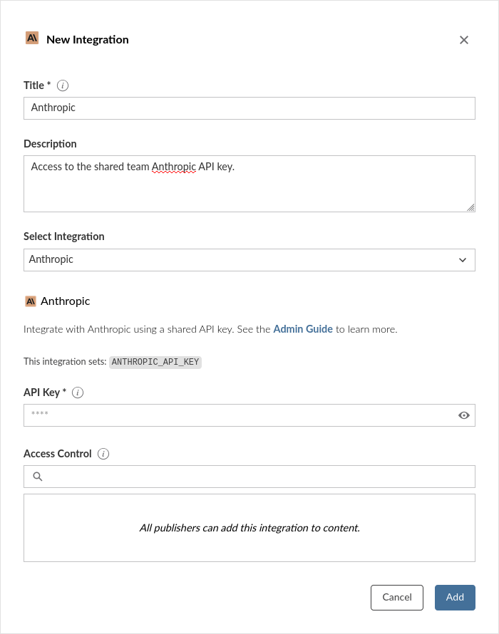 Once the integration is configured, publishers can use it in their content. Most Anthropic client libraries detect the ANTHROPIC_API_KEY environment variable by default: