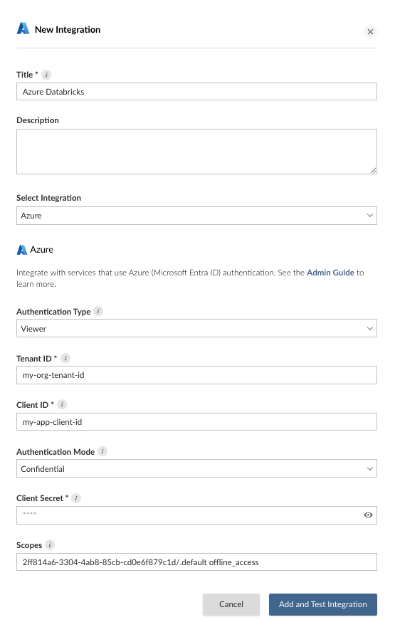To configure an Azure Databricks integration, use the general Azure template with the value 2ff814a6-3304-4ab8-85cb-cd0e6f879c1d/.default in the scopes field.