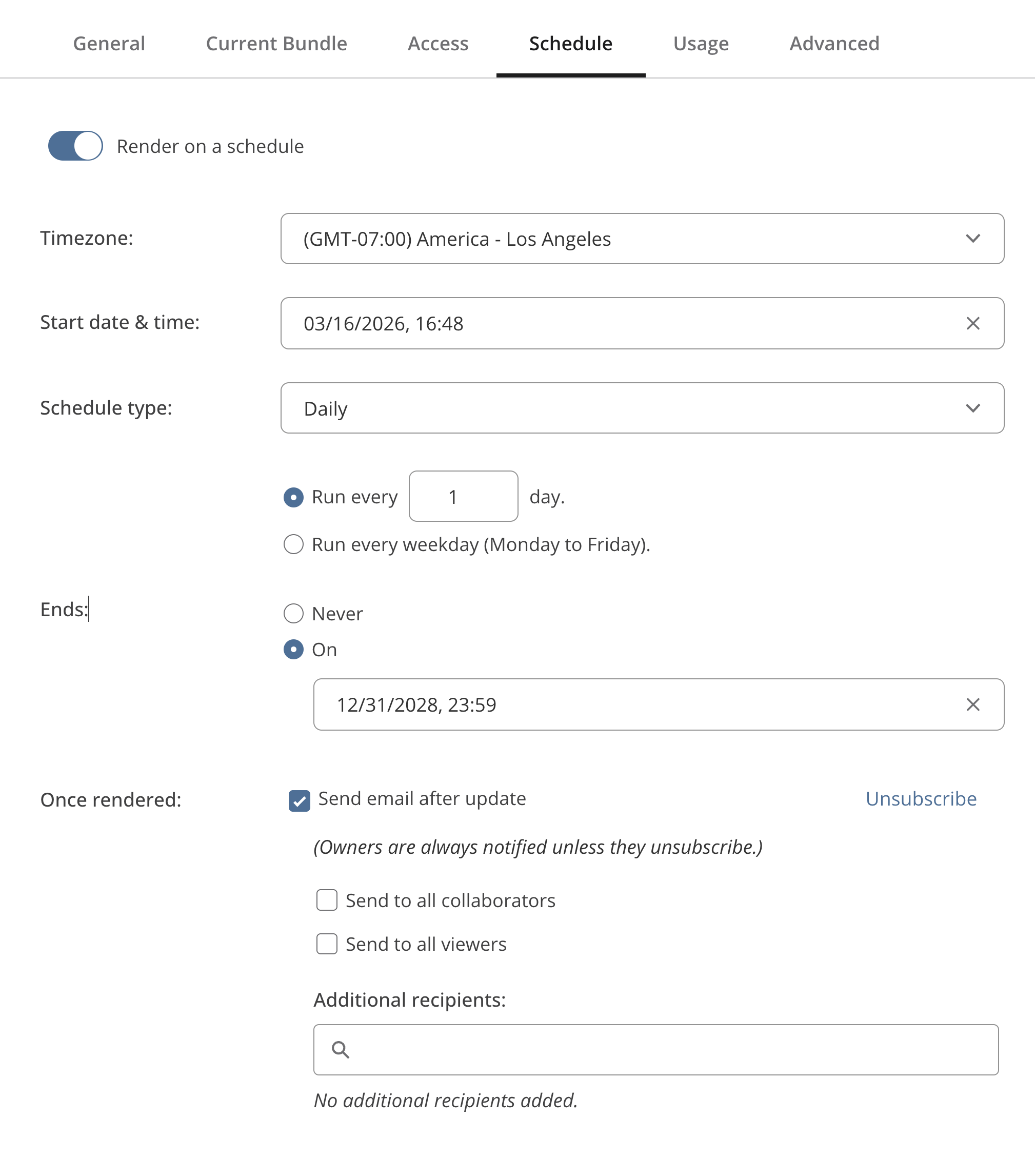 This section of the schedule configuration determines if and where emails are delivered after execution. If checked, the owner of the content will always be notified unless they unsubscribe. Content output can be sent to:
