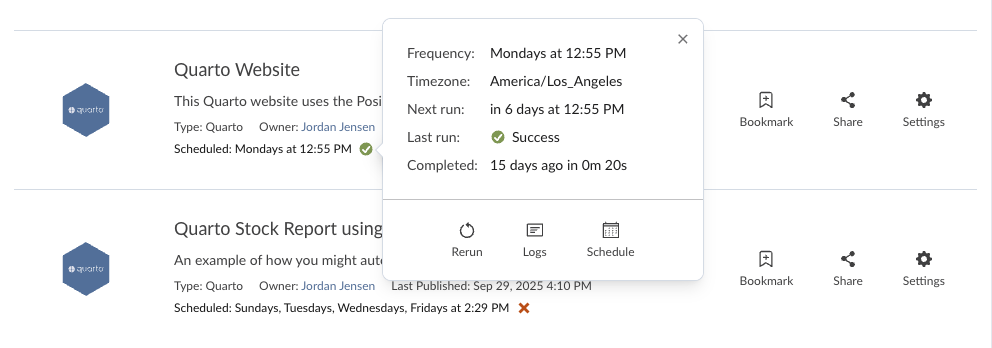- Green checkmark: Last scheduled run succeeded