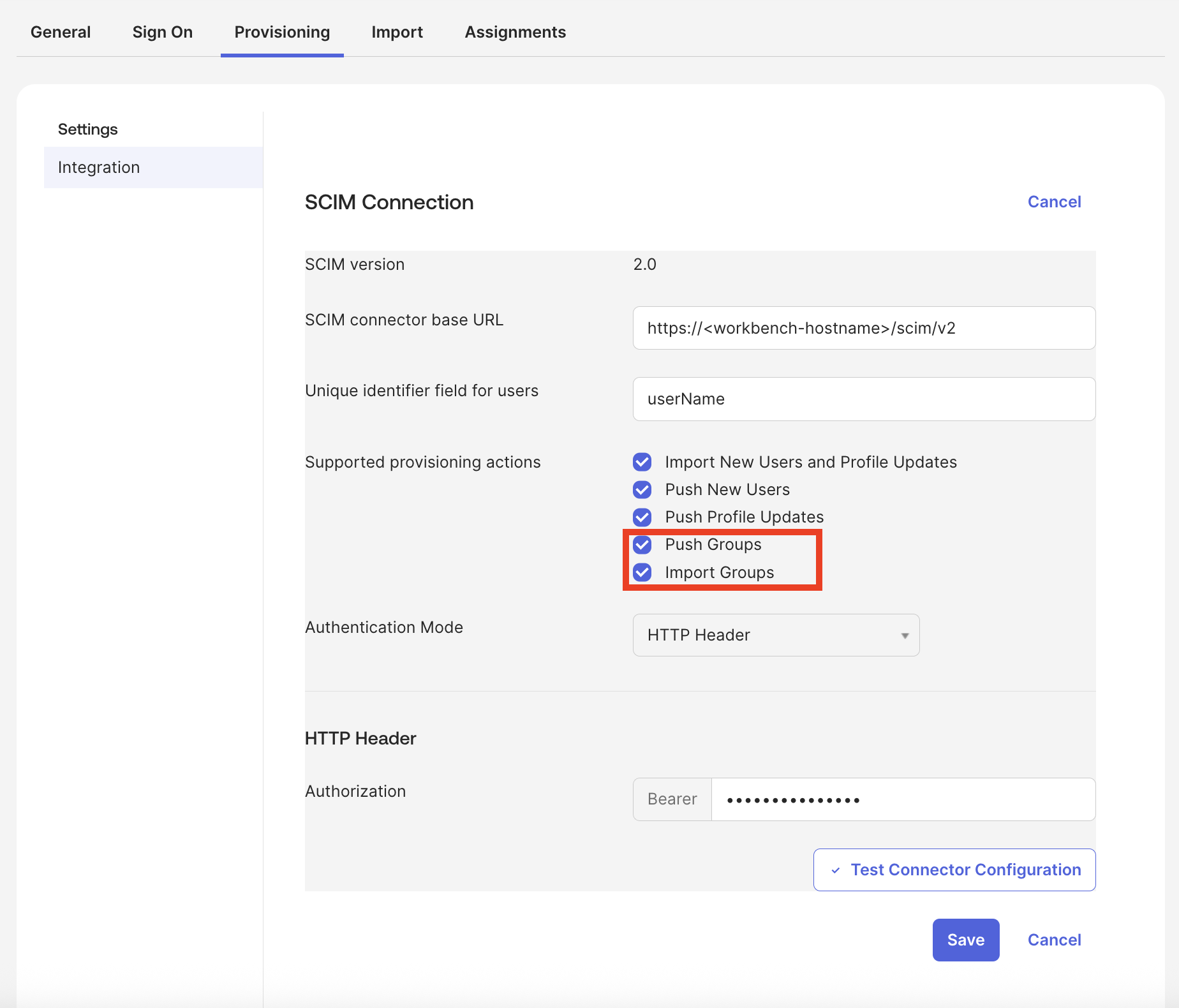 Once your authentication application is configured in Okta, you can configure Okta to use Workbench’s SCIM API to provision users.