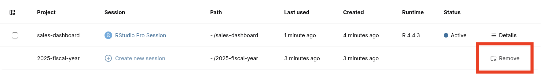 Selecting the row of an existing project and then clicking New Session.