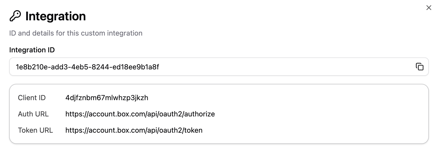 - Integration ID (GUID): The unique identifier required for programmatic access. Copy this value using the copy button to use it in your code.