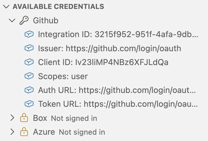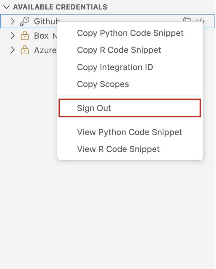 | View Credential Code Snippet | Open a read-only editor tab with the generated code snippet for the selected integration. |