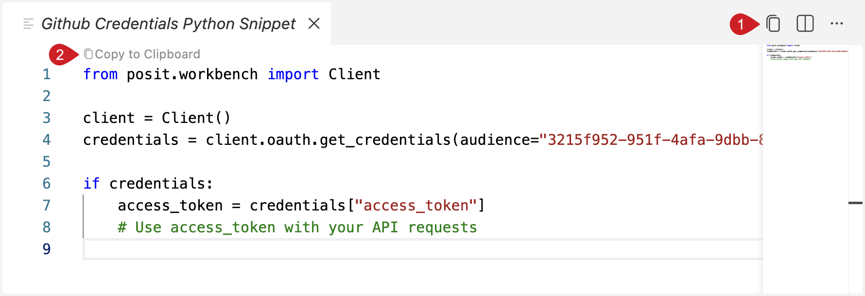 The Available Credentials view can generate ready-to-use Python or R code for retrieving OAuth credentials. This is a quick way to get started with the posit-sdk (Python) or rstudioapi (R) packages.