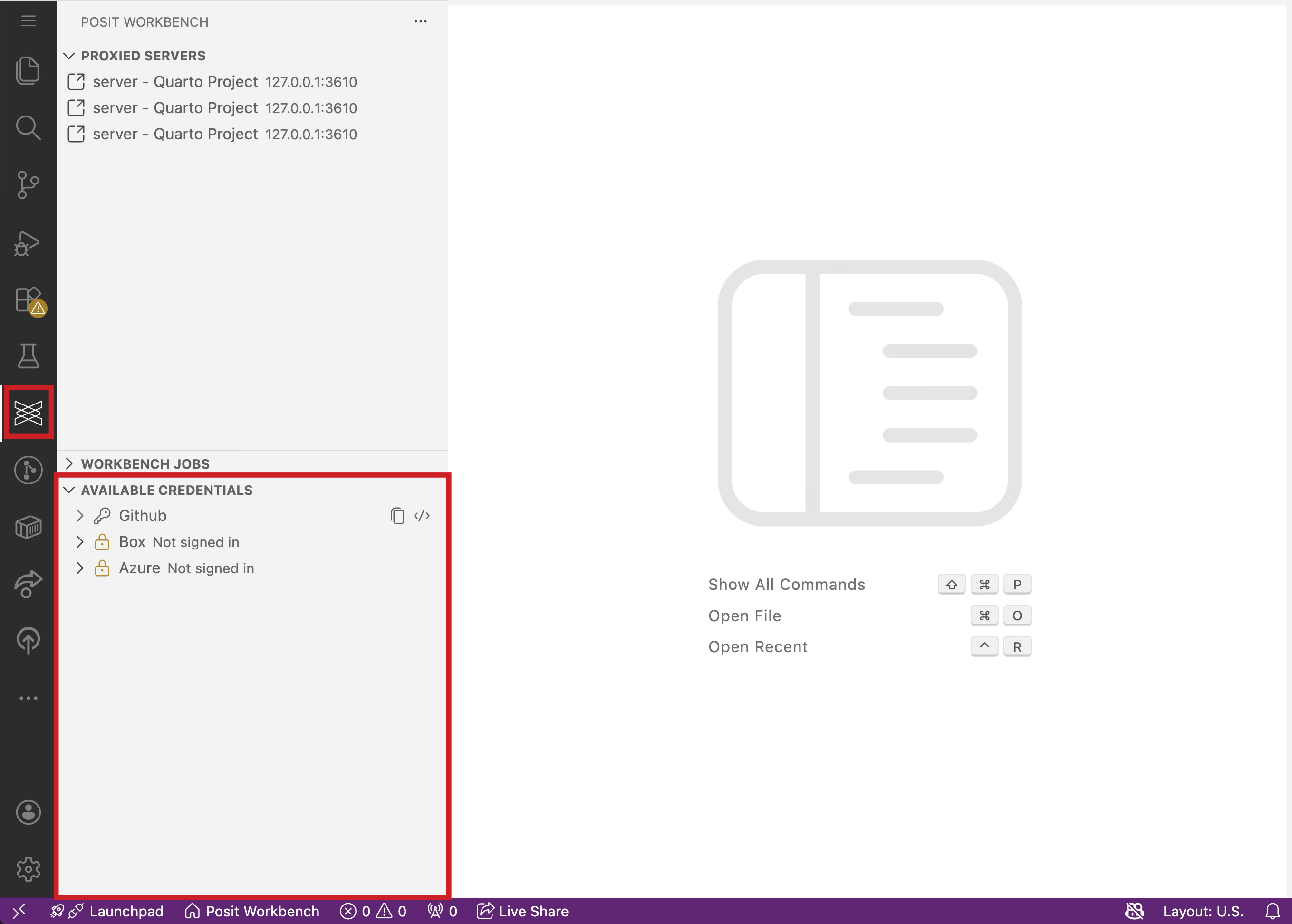 The Available Credentials view is part of the Posit Workbench extension sidebar. It displays custom OAuth integrations that your administrator configured and lets you manage authentication directly from the IDE.