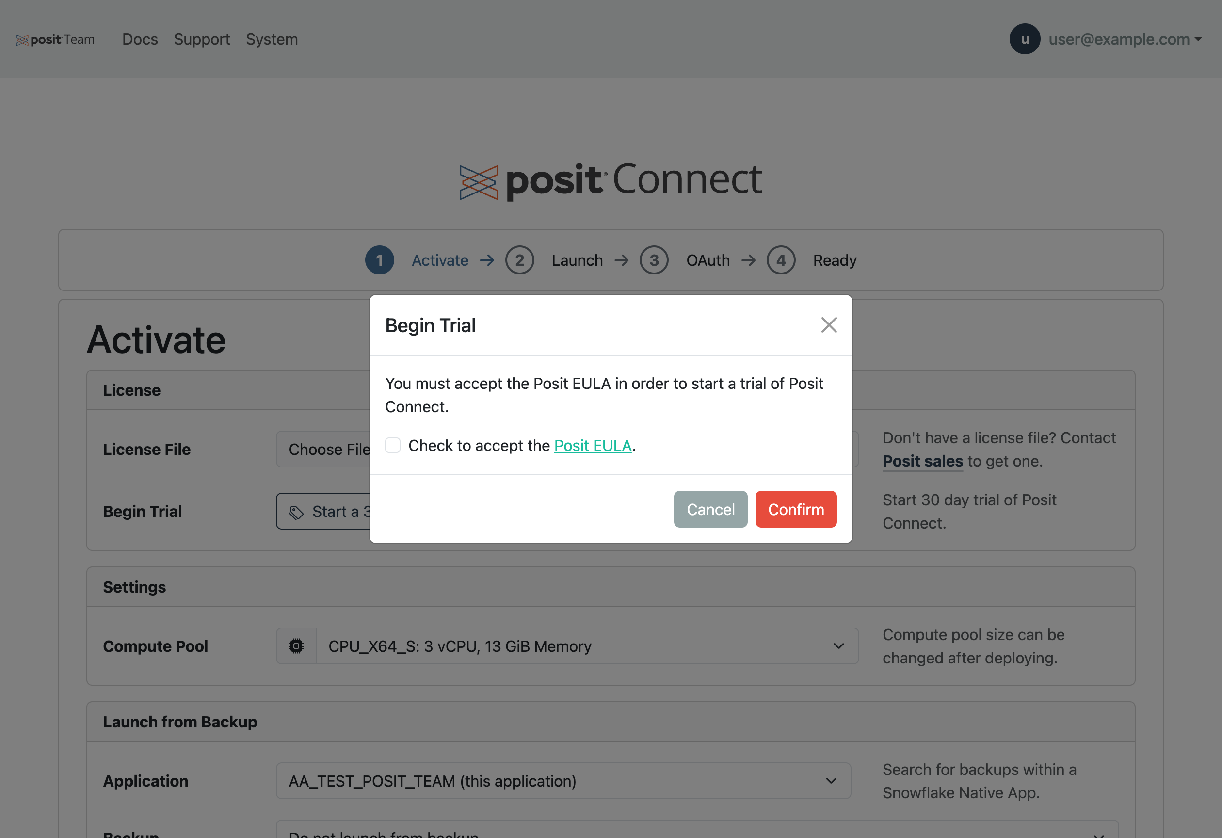 Alternatively, Posit Team supports a free 30-day trial of Connect that you can start by clicking the Get a free trial license button. A modal will appear asking you to agree to the Posit EULA. You will need to contact sales (snowflakemarketplace@posit.co) to purchase a license before the 30-day trial expires to continue normal operation of Connect.