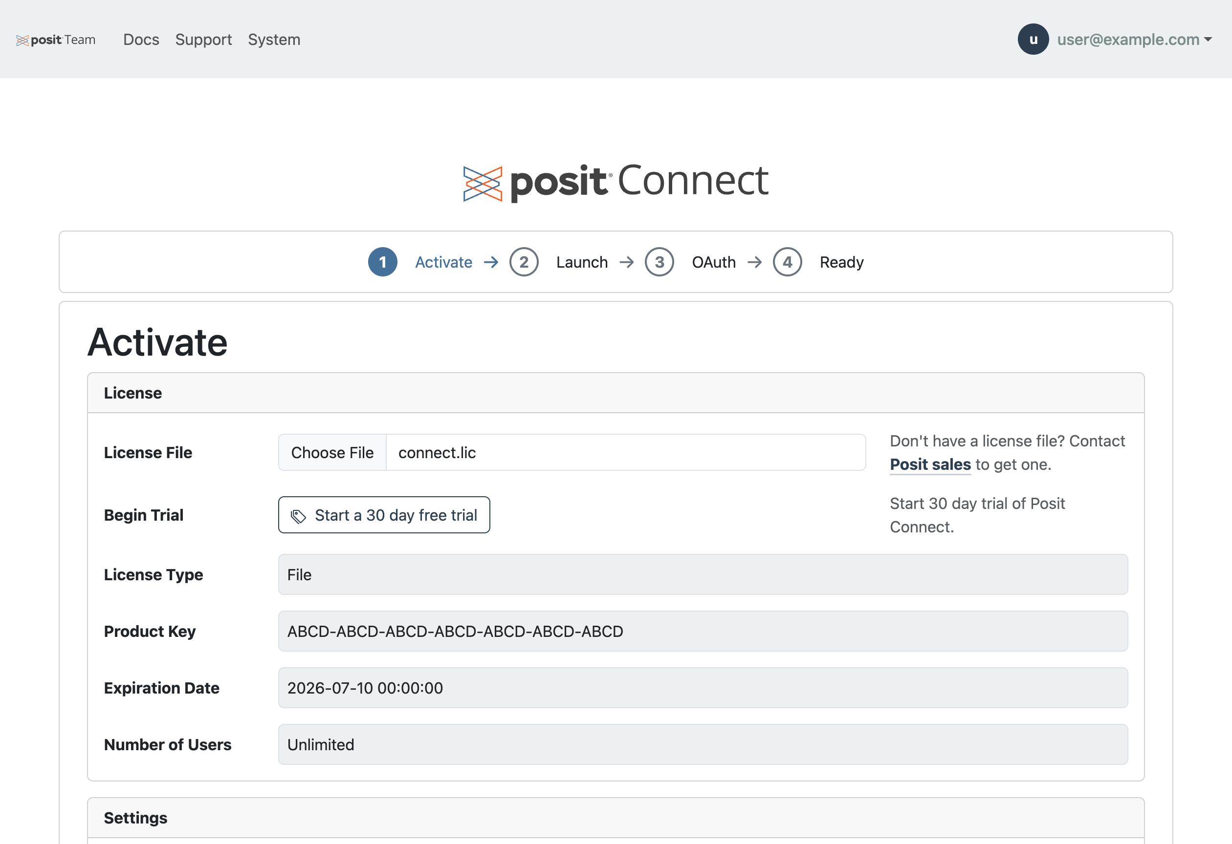 Posit Connect requires a valid Advanced license file. If you think you have a valid license file, just upload via the file input and it will be validated. If you don’t have a license file, please contact Posit sales.