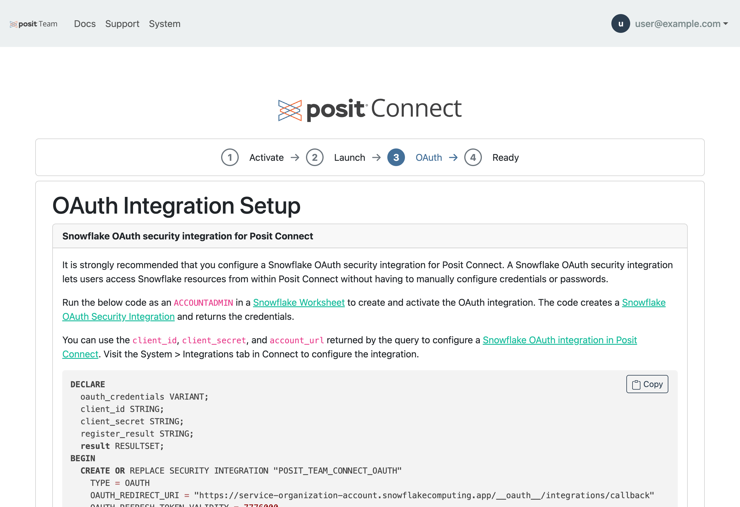 Use the client_id, client_secret, and account_url returned by the query to configure a Snowflake OAuth integration in Posit Connect.