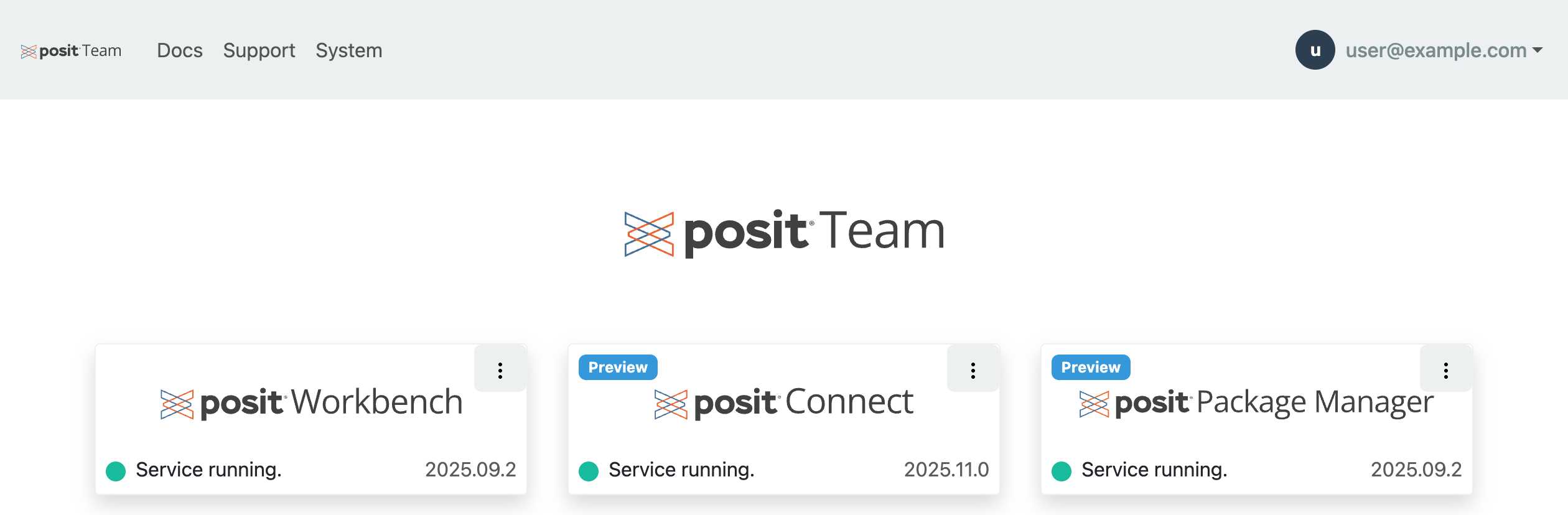 After installing Posit Team, configure and launch the products you want to run. Click on the individual product card from the Posit Team landing page to get started.