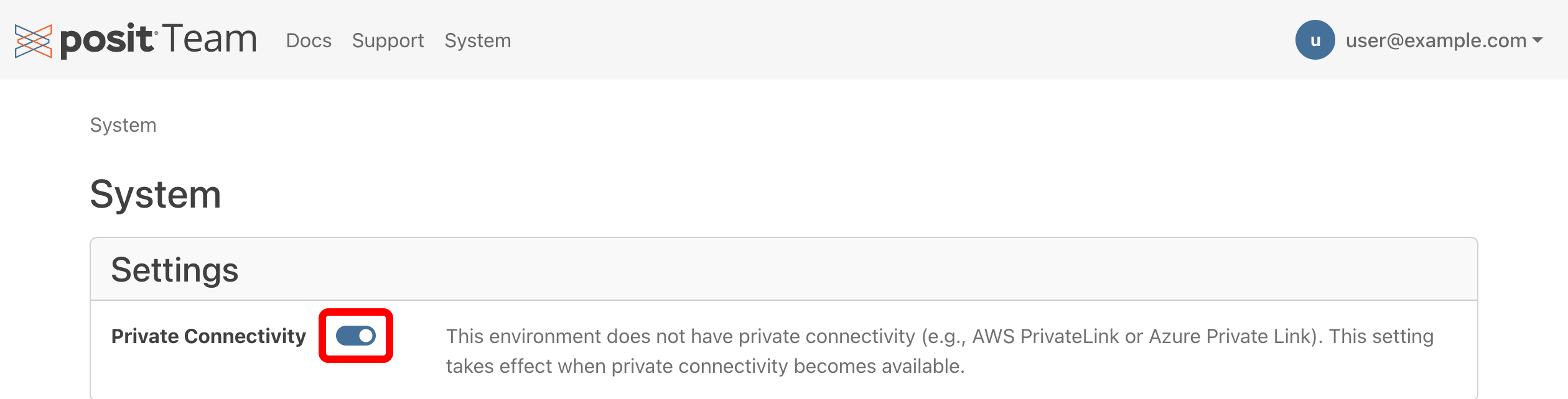 Private connectivity requires an environment which includes private endpoints. You can configure the toggle before private endpoints are available. The setting takes effect when Posit Team starts in an environment where it detects private connectivity.