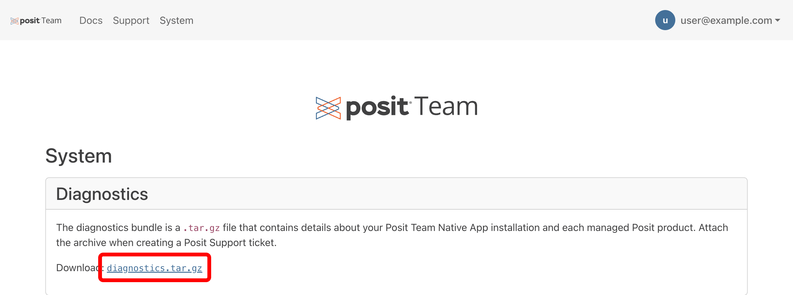 Download the diagnostics bundle from the System page in the Posit Team UI.