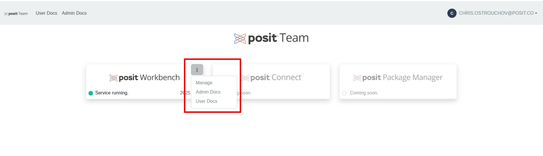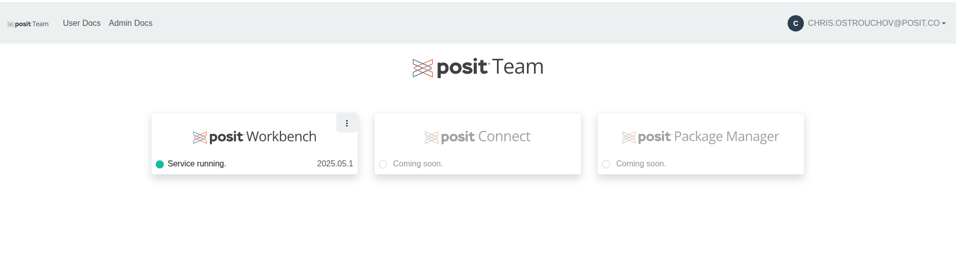 Users can easily access Workbench by clicking the Posit Workbench logo or card.