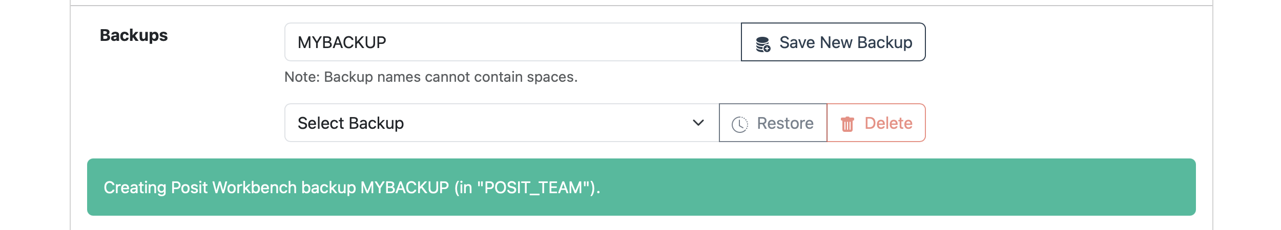 Posit Team supports easily creating Workbench backups. Simply specify a backup name or leave it blank for a randomly assigned name and click Save New Backup.