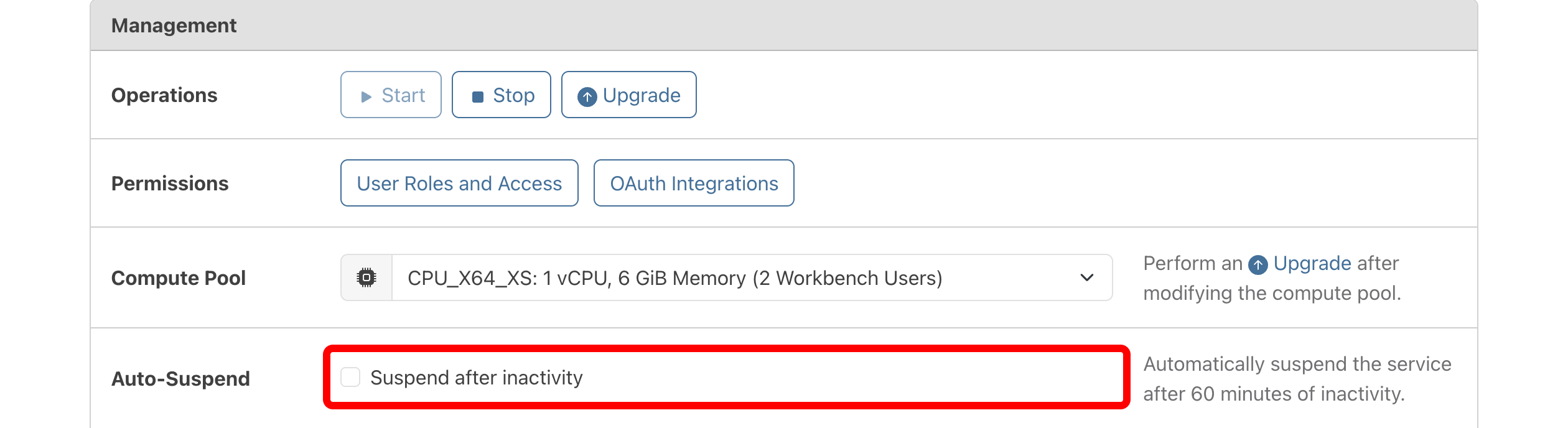 If there are times when Workbench is not used, such as on weekends and holidays, suspending the service can help reduce your Snowflake compute costs.