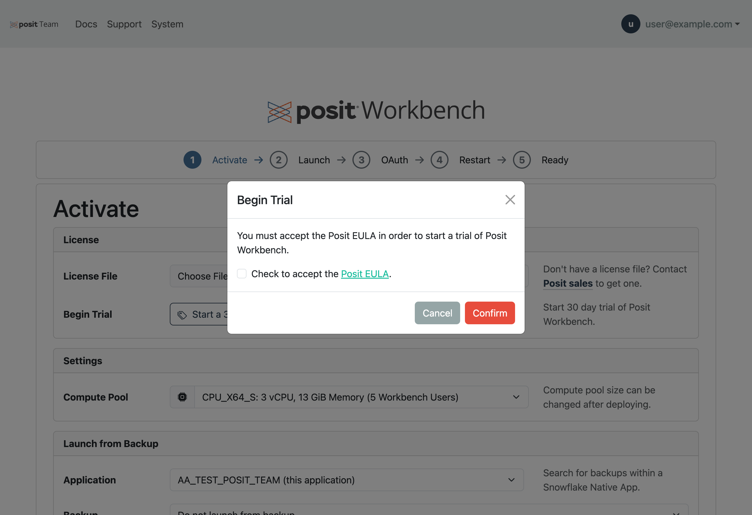 Alternatively, Posit Team supports a free 30-day trial of Workbench that you can start by clicking the Get a free trial license button. A modal will appear asking you to agree to the Posit EULA. You will need to contact sales (snowflakemarketplace@posit.co) to purchase a license before the 30-day trial expires to continue normal operation of Workbench.