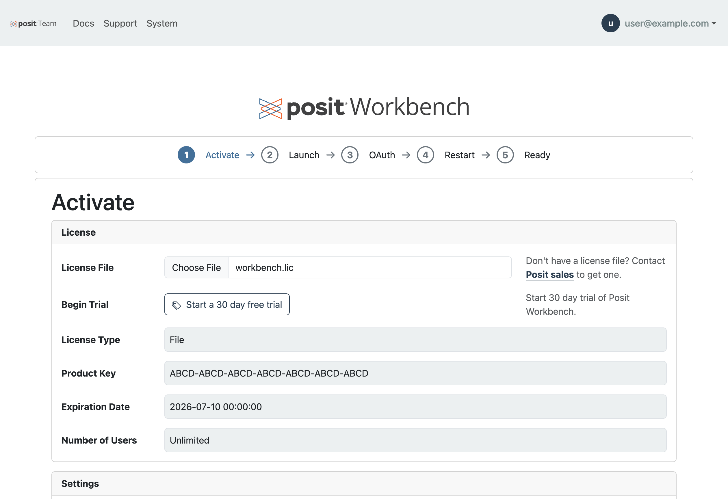 Posit Workbench requires a valid Advanced license file. If you think you have a valid license file just upload via the file input and it will be validated. If you don’t have a license file please contact Posit sales.