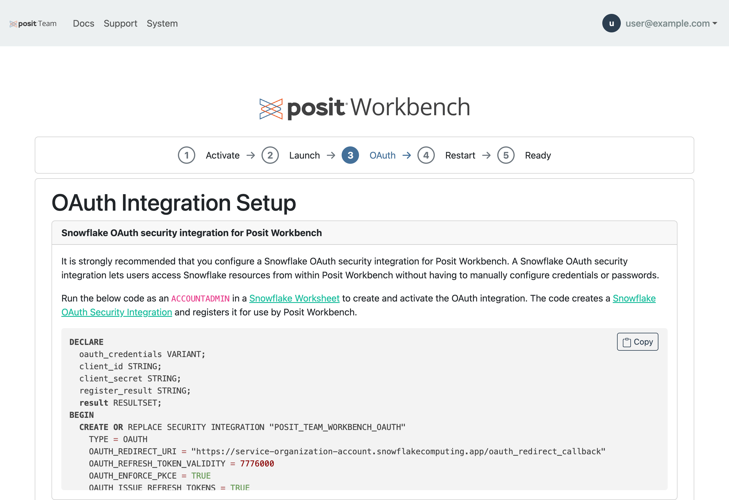 It is strongly recommended that you configure a Snowflake OAuth security integration for Posit Workbench. A Snowflake OAuth security integration lets users access Snowflake resources from within Posit Workbench without having to manually configure credentials or passwords. For more details see the official Workbench docs on Snowflake managed credentials.