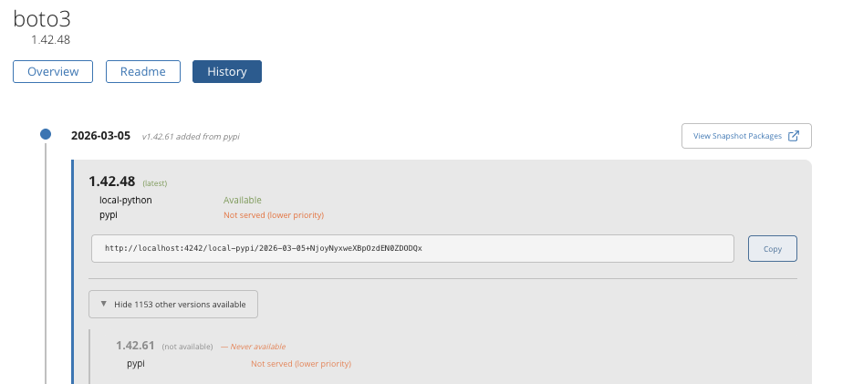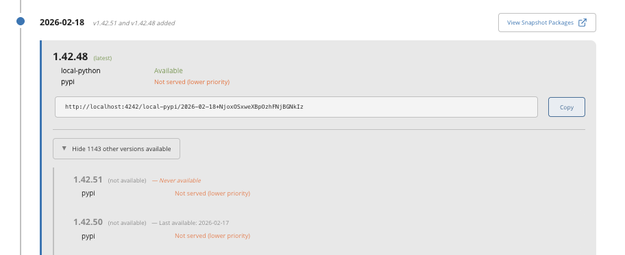 Not served with Never available: When a lower-priority source adds a new version (v1.42.61 from pypi), it appears as “Not served (lower priority)” with “Never available” because the higher-priority local-python source continues to serve its own version (1.42.48).