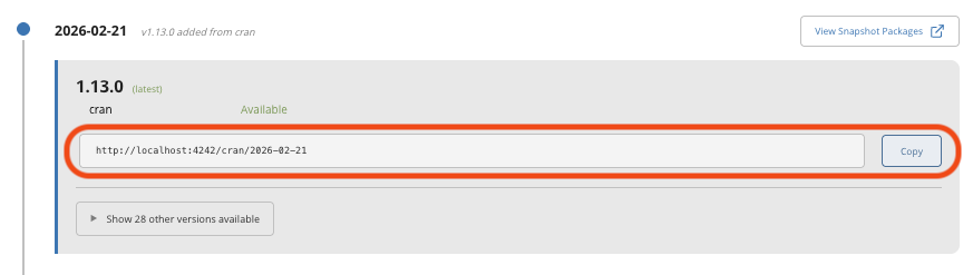 Use the snapshot URL in your renv.lock, requirements.txt, or R/Python configuration to pin to a reproducible set of packages. For more details on configuring frozen URLs, see Getting frozen URLs for improving reproducibility.