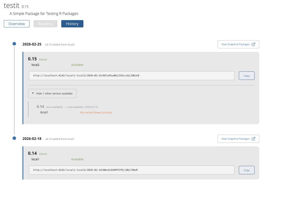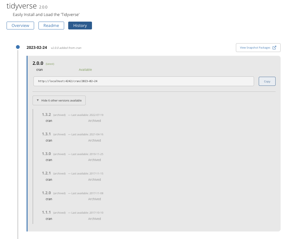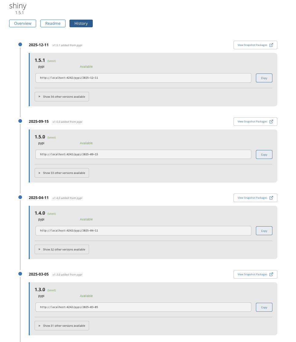 The History tab on the package details page provides a chronological timeline of every change that affected a package’s availability. Use it to understand when each version became available, which source provides it, and to get snapshot URLs for reproducible environments.