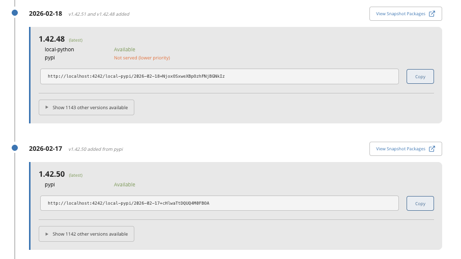 Each timeline entry includes a snapshot URL that pins your environment to the exact set of packages available at that date.