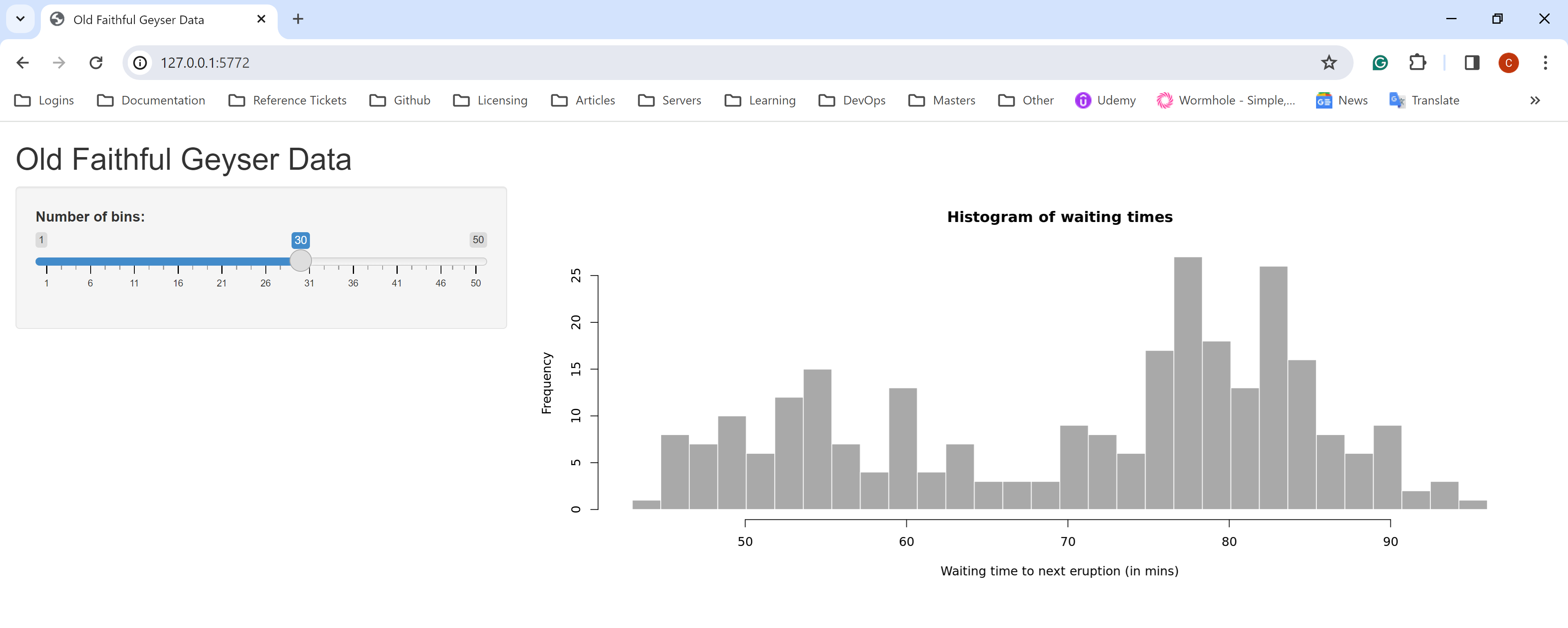 server <- function(input, output) { output\(distPlot <- renderPlot({ # generate bins based on input\)bins from ui.R x <- faithful[, 2] bins <- seq(min(x), max(x), length.out = input$bins + 1)